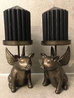- Kandelaar (2) - Hars, Metaal, Rubber - Varkens met vleugelsTwee metalen kandelaars op decoratieve varkens met vleugels, bruin, gemaakt in italië, in een eigentijds chic ontwerp, geschat periode 2025, afmetingen 130 x 80 x 110 mm, gewicht 100 g, in uitstekende