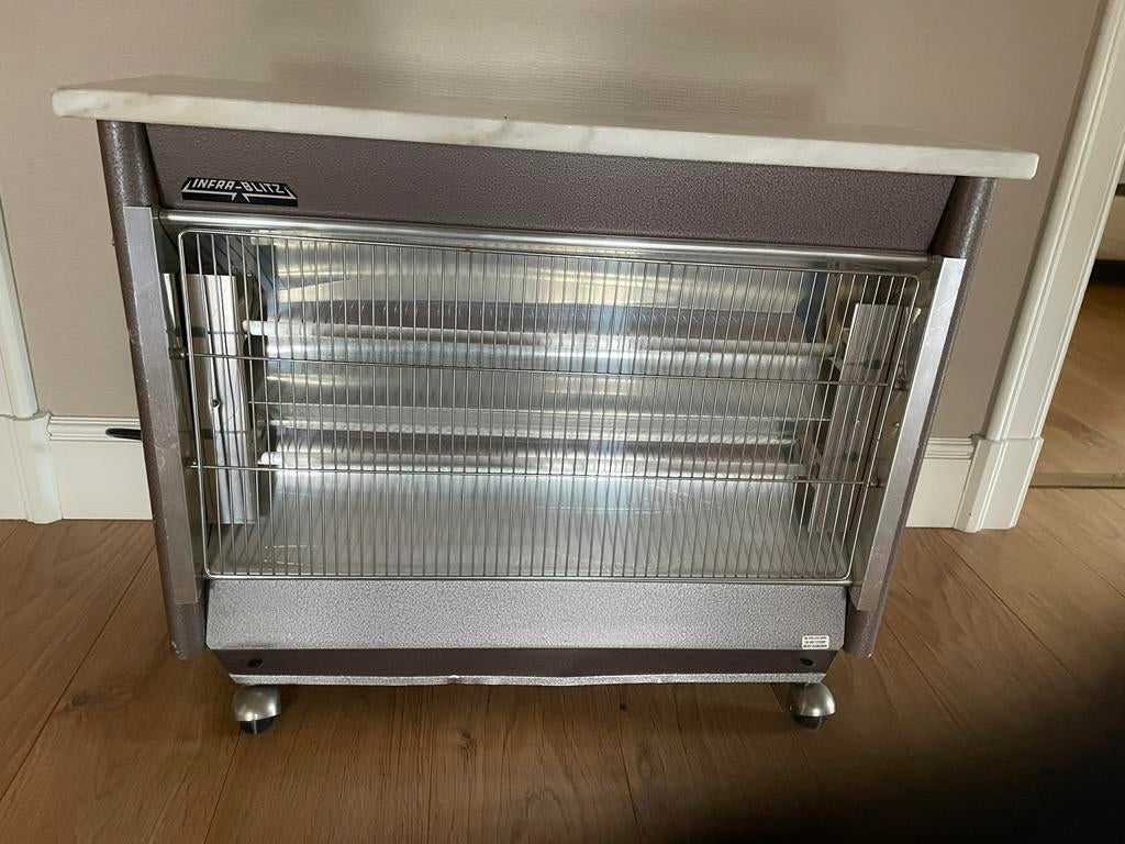 2 feb 26pallemans paulKapellen - Infra-blitz elektrische verwarmingElektrische verwarming van infra-blitz met mooi marmeren blad, op wieltjes dus handig te verplaatsen. Werkt nog zoals het hoort. Afmetingen: breedte 76cm hoogte 59cm diepte 24cmGebruikt Ophalen