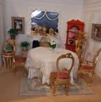 11 apr 26SArentBierbeek - Miniatuurhuis (10) - miniaturen van de eetkamer - FrankrijkTien 1/12-schaal franse kasteel-eethoek miniaturen, met de hand gemaakt in de jaren 2000 in normandië, frankrijk, vervaardigd uit hars, hout en textiel, in vintage zeer goede staat. Lot van 10 stukken