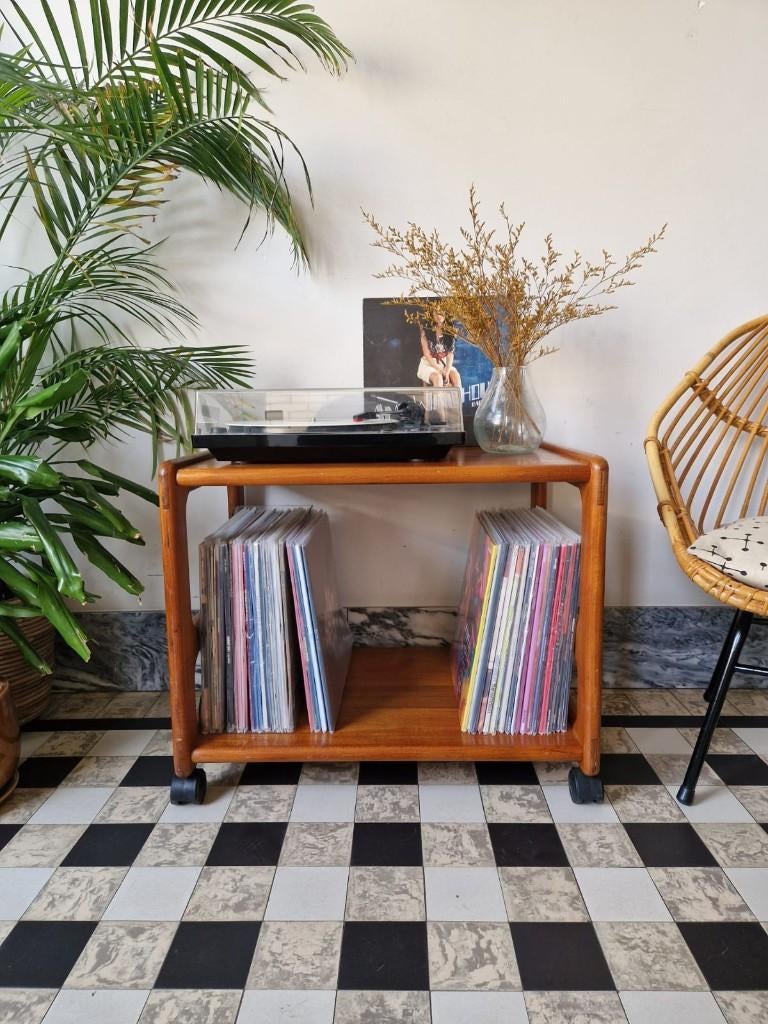 VandaagTopadvertentieCatawikiHeel België - Vintage midcentury Deens platenspeler meubel | trolleyZeer mooie vintage midcentury deense trolley uit massief teakhout met zwarte wieltjes eronder. Kan perfect dienen als platenspeler meubel, met je platenspeler erop en je favoriete elpees onderaan! - AZo goed als nieuw Ophalen