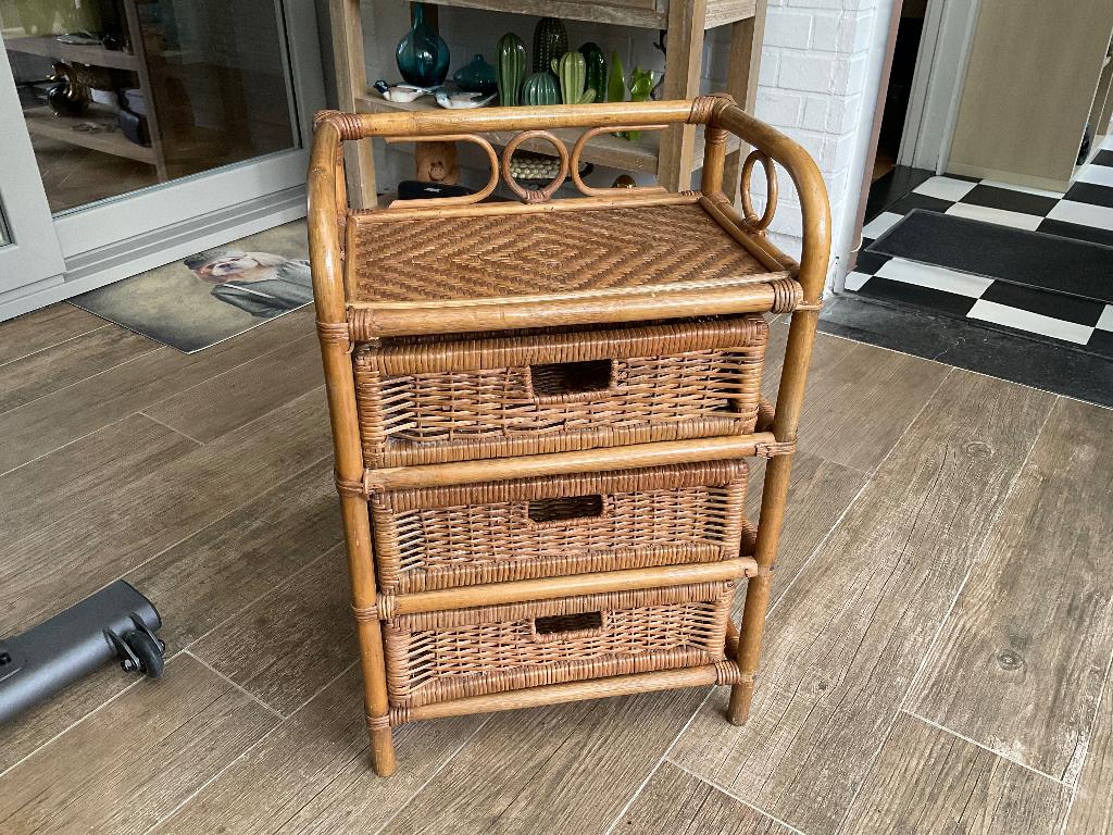 VandaagTopadvertentieCatawikiHeel België - Vintage rotan ladenkastPrachtige vintage rotan ladenkast jaren 70, 4 lades met bamboe handgrepen, hoogte 80 cm breedte 55 cm diepte 37 cm.Gebruikt Ophalen