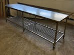 VandaagHoreca Inventaris.nlHeel België - RVS Werktafel met opstand op wielen, Tafel, B305 x D90 xRvs werktafel met opstand, tafel, b305 x d90 x h96cm artikelnr. Wt6473-1488 breedte 305cm diepte 90cm hoogte 96cm, hoogte achteropstand 8cm met 6 wielen 1 op voorraad alle soorten gebruikte winkelinve
