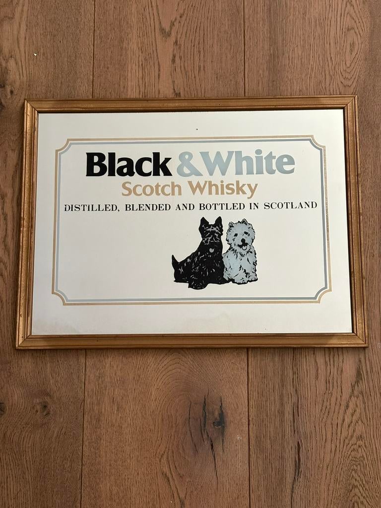 29 jun 22SellekaertsKoksijde - BLACK & WHITE SCOTCH WHISKY - RECLAMESPIEGEL-vintage reclame spiegel black & white scotch whisky -afmetingen 40 x 30 cm - spiegel in goede algemene staat - minieme sporen van ouderdom of gebruik bekijk de afbeelding aub voor meer details geGebruikt Ophalen of Verzenden