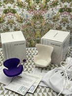 - Fritz Hansen, Minimii - Arne Jacobsen - Stoel (4) - EggEen set van vier deense schaalmodellen van arne jacobsen-miniaturen stoelen en behang van fritz hansen en minimii, met onder meer een witte egg chair en een paarse swan chair (beperkte oplage), plus t