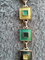 28 jan 26MvdsMoorslede - Yves Rocher armband met blauw/turkoois vierkant patroonYves rocher verstelbare armband met blauw/turkoois vierkant patroon (minimale lengte in uitgevouwen toestand = 16,5 cm), licht bezoedelde zilverkleur (zie foto).Gebruikt Ophalen of Verzenden