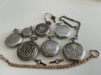 GisterenTopadvertentieCatawikiHeel België - Zeven oude zakhorloges , sleutels en ketting __ voorZeven antieke zakhorloges met een ketting en drie opwindsleutels, geschikt voor herstelling of onderdelen; alles gedragen en beschadigd, werkt niet, diameters van 3,5 tot 5,5 cm en een totaalgewicht v