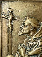 GisterenTopadvertentieCatawikiHeel België - Gedocumenteerd model in museale collecties - Verguld brons -Rechthoekige bronzen plaquette met een reliëfdecor van de heilige franciscus van assisi in gebed voor een kruisbeeld, staand in profiel.de scène, van grote spirituele intensiteit, is verrijkt met de a