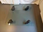 Salontafel met glazen blad van 100x100x25cm. 4 Zwarte industriële (werkende) wielen. Design object van gea aulenti!! Beschadiging