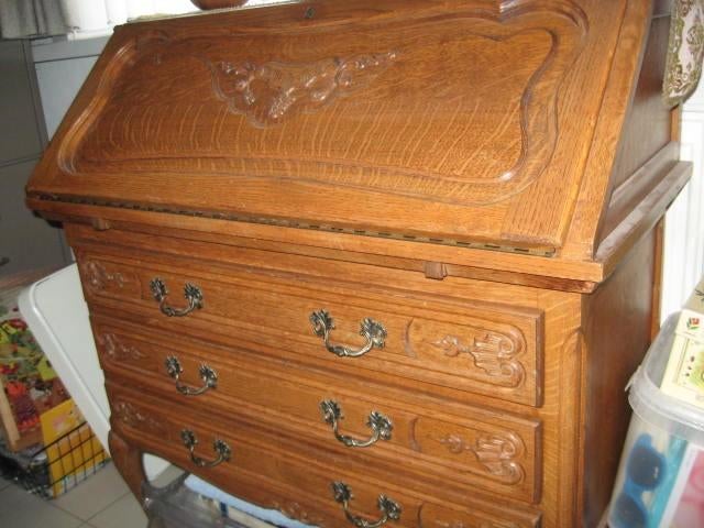 Massief houten, gesculpteerde secretairebureau in heel goede staat. Zo goed als nieuw breedte: 90 cm hoogte: 103 (totale hoogte) diepte deksel dicht: 43 diepte deksel open: 76 hoogte pootjes: 33 aange