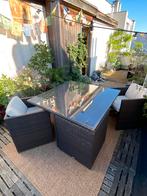 Meubels van geweven hars, vertonen lichte gebruikssporen. De kussens van de 4 stoelen zijn allemaal aanwezig, beige kleur afmeting