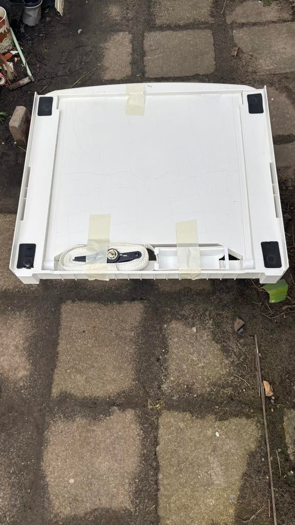 Word gebruikt om onder een vaatwasser / droogkast of wasmachine te leggen om op hoogte te monteren ( op elkaar ). Is in nette staat wel gebruikt. Bandje op strak te zetten is nieuw.
