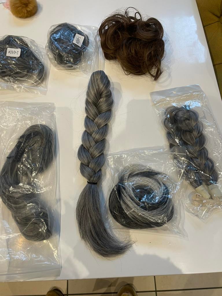 Verschillende soorten haarstukjes, om zelf aan te brengen in haar, door middel van clip, rekkertje of schuiver. Zo kan je uw haar of paardenstaart opsteken en voller maken kleuren: bruin en/of grijs m