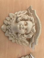 2 engelgezichten. Om op te hangen. Dient als boordje. Steen. Gebruikt doch nergens een stukje af.