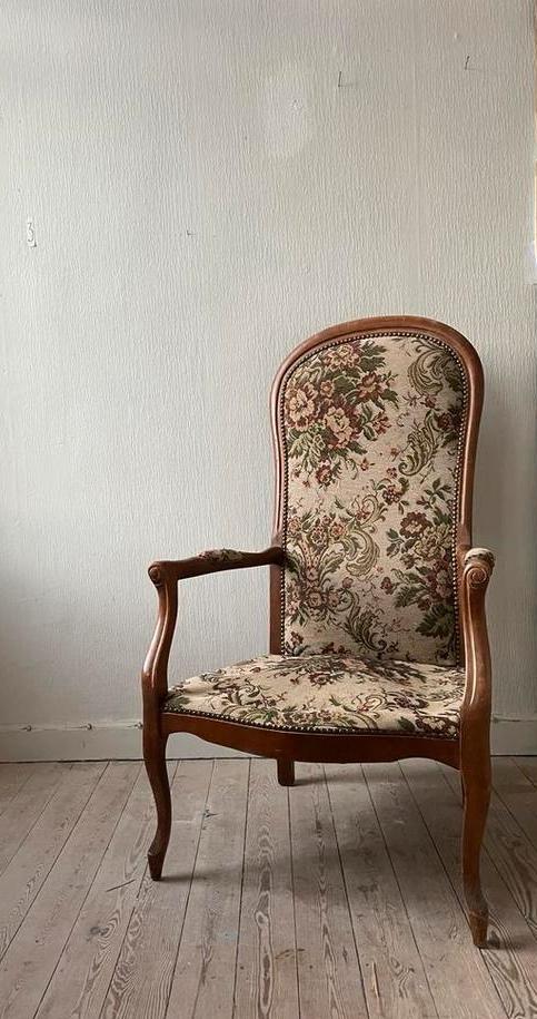 Authentieke zetel. Dient opnieuw gestoffeerd te worden. Zithoogte 32 cm leuning 110 cm armleuningen 60 cm zitting is 50cm diep, 55 tot 45 cm breed.
