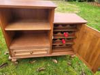 Charmante houten kast met een praktische indeling. Links bevindt zich een open opbergvak met legplank en onderaan een brede lade. Rechts zit een deurkast met ingebouwd wijnrek voor 12 flessen (zoals t