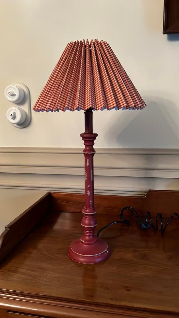 Brocante tafellamp in donkerrode kleur. Totale hoogte: 50 cm totale breedte kapje: 26 cm in zeer goede staat
