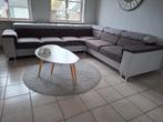 Hoekzetel ,bruin, lichtgrijs gecombineerd. Goede stevige zetel ,enkel beschadigd aan hoofdsteun. De kortste kant is 2m75 x 1meter(diep) de langste kant is 3m10 x 1 meter(diep) voetstuk kan uitgetrokke