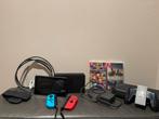 Nintendo switch 1 met hoes, oplaadkabel, hdmi kabel, beenband nintendo switch sports en 3 games: nintendo switch sports die bij het apparaat is, hogwarts legacy en mariokart 8 deluxe