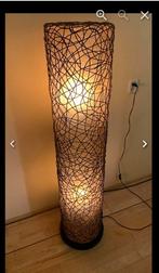 Productomschrijving italiaanse vloerlamp van glasvezel en rotan uit de jaren zestig. Rond model op een ronde zwart gelakte houten voet. Hoog staande lamp van glasvezel die is omwikkeld met bruine rota