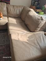 Lederen beige zetel in heel goede staat. Houten poten. 2.30M breed en 2.40M diep