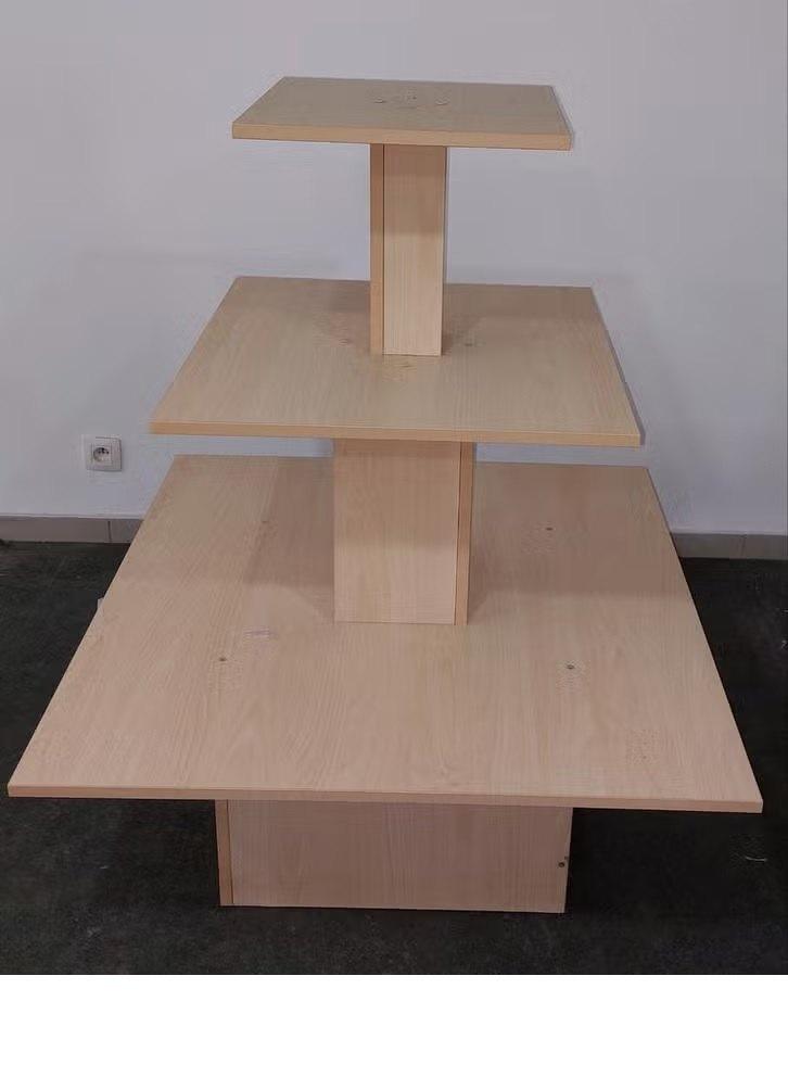 Presentatietafel met 3 niveaus in propere staat. Mooi als display in winkels om artikelen uit te stallen. 3 Stuks beschikbaar. Afmeting onderste stuk is 90 x 90 cm €50/stuk
