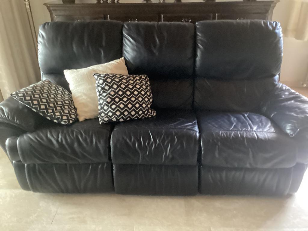 Mooie blauwe ledere salon met vier manuele relaxen de zetel van drie twee en de één zitten elk de zetel van drie b 220 cm h 100cm d100 cm twee een zitten van b 110cm h 100 cm d 100 cm