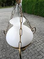 Oude plafondlamp witte glazen omhulsel. Daarbinnen een glazen koker. Messing (welicht bronzen) ornamenten. Ophalen in hechtel
