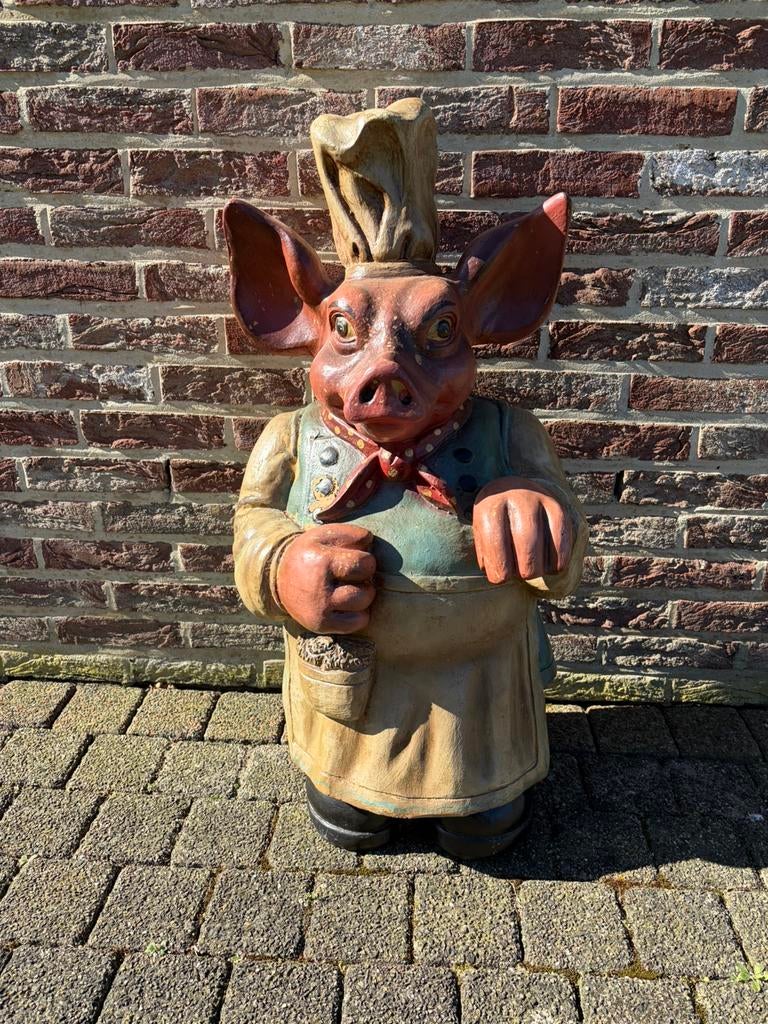 Varken met koksmuts komt uit slagerij, etalage materiaal polyester hoogte 80 op 40 cm breed goede staat
