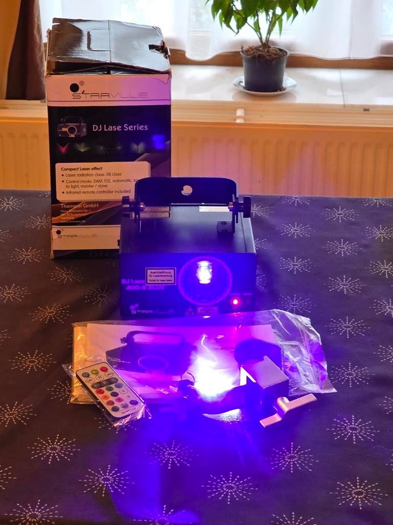 Blauwe laser te koop in uitstekende visuele en functionele staat. Wordt verkocht met voedingskabel, afstandsbediening, mobil trus-haak en gebruikershandleiding.