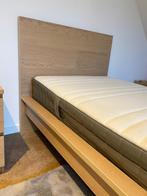 Bed 90x200 in eik fineer met zeer degelijke lattenbodem en pocketverenmatras 24cm dik. Geen beschadigingen of vlekken.
