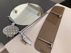 Ronde spiegel van 40cm diameter met 3 ophanghaken en vijzen. Tabel in gefumeerd glas 60cm lang en 15cm breed. 1 Handdoekophang systheem 1 zeephouder 1 toiletpapier houder