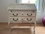 Secrétaire en chêne massif cérusé blanc en parfait état comprenant 2 tiroirs et un plateau refermable. Petits espaces de rangement et tiroirs derrière le plateau. Fourni avec la clef de fermeture du p