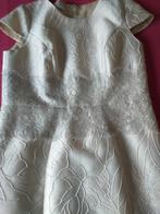 Off-white jurk, stof ingelegd met borduursels, kant aan de voor- en achterkant taille, mid-back loopsplit, mid-back rits, knieleng