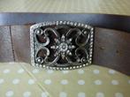 Lederen riem voor dames met gesp versierd met bloemenmotief en strass steentjes. In zeer goede staat - soepele riem - zonder beschadigingen. Totale lengte leren riem: 106 cm - breedte riem: 6 cm