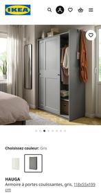 Penderie ikea "hauga", très peu utilisée (achat fin 2024) et en très bon état. Une planche supplémentaire pour étagère intérieure est offerte. Couleur : gris clair. Dimensions : 118cm de lar
