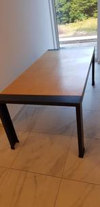 Grote stabieletafel met stevig glad kunststofblad in wortelhoutprint en met zwarte metalen poten (zie foto). Ruim plaats om 3 stoelen naast elkaar te plaatsen afmetingen 194 cm lang en 90 cm breed. Po