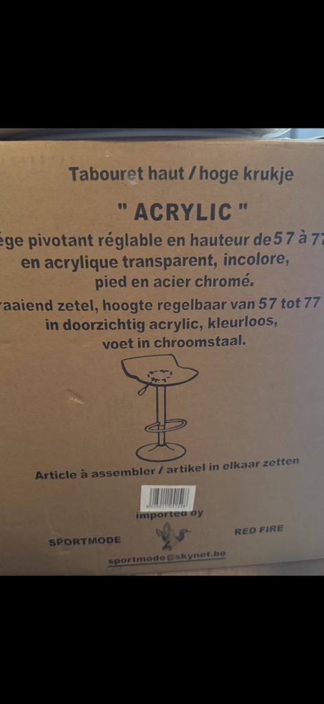 Hoge barkruk 3stuks nog in verpakking zelf in elkaar steken van kruk draaiend zetel in hoogte regelbaar met doorzichtig acrilic voet in chroomstaal prijs voor 3barkrukken samen €25