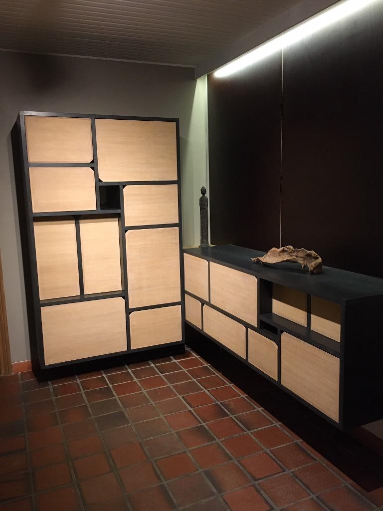 Speelse, originele combinatie --> in hoek of apart te plaatsen. Toonzaalmodel --> op te frissen, maar in goede staat. Materiaal: ° zwarte mdf - afwerking matte vernis ° eik fineren deuren + ladeZo goed als nieuw Ophalen