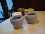 Ronde cachepots h 11 cm/ 10 cm diameter (wit/paars), h 13 cm 11 cm diameter (roze) vierkante cachepot h 12 cm / 12cm diameter (groen) in perfecte staat. Afzonderlijk te koop voor 3€/stuk 12€