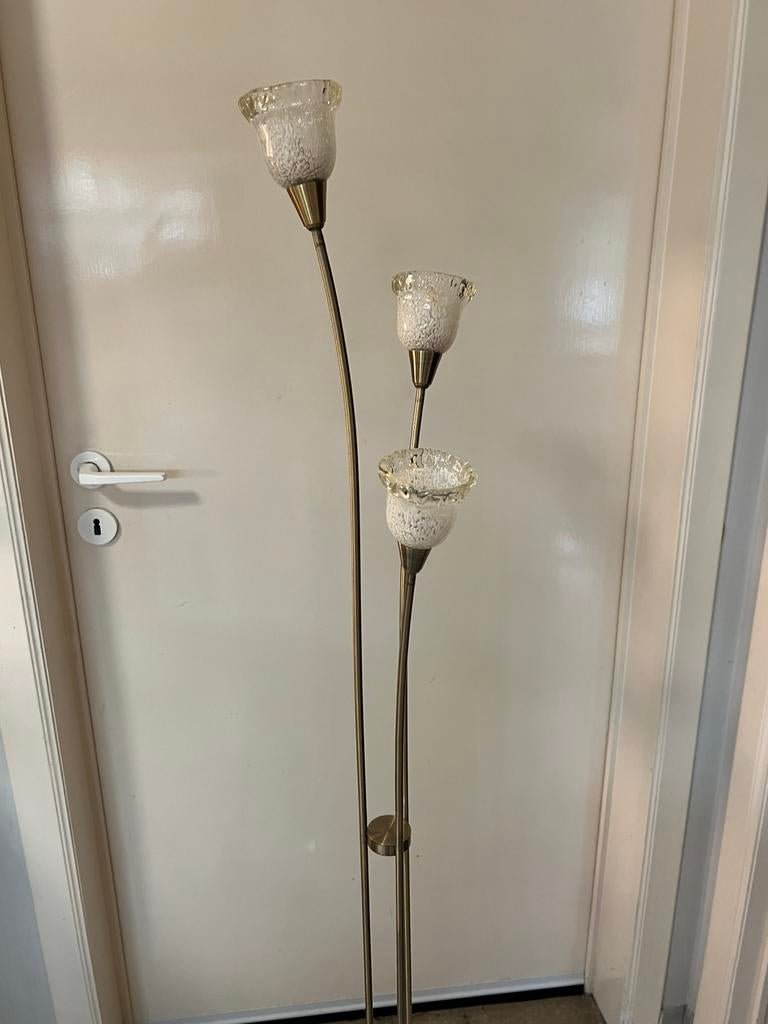 Staanlamp , drie delig , 160 hoog , voet22cm diameter , koper met glas