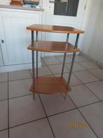 Praktisch bijzettafeltje in lichte beukkleur. Hoogte is 75 cm, breedte is 45 cm en diepte is 30 cm. Afstand tussen de plankjes is onderaan 43 cm en bovenaan 13.5 Cm. Op het bovenste plankje is achtera
