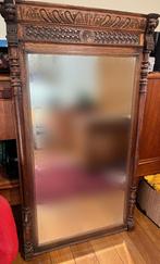 Trumeau spiegel in massief eik mooi versierd met houtsnijwerk, klassieke leeuwenkoppen op hoeken. Facet geslepen randen maten: h*b: 151*88 kader - 119*67 spiegel