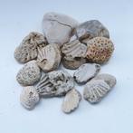 Een verzameling van 12 fossiele stenen met diverse maritieme afdrukken (schelpen, aangetast door boorspons, koraalskelet ...) Op de 2 foto's zie je de voor- en achterzijde op dezelfde plaatsen.