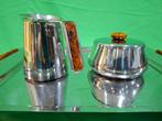 Roestvrijstalen douwe egberts dienblad, suikerpot en melkkan. Gemaakt in italië van roestvrij staal 18-10. Mogelijk jaren 50. In g