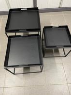3 bijzettafeltjes in smeedijzer met aparte dienbladen maten 50x50:44x44:38x38