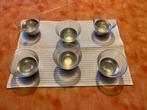 6 dessertschaaltjes van het merk bruckmann (made in germany). Ze zijn 8 cm hoog en hebben een diameter van 9,5 cm. Het voetstuk kan gevuld worden met ijs, zodat uw dessert of voorgerecht fris blijft.