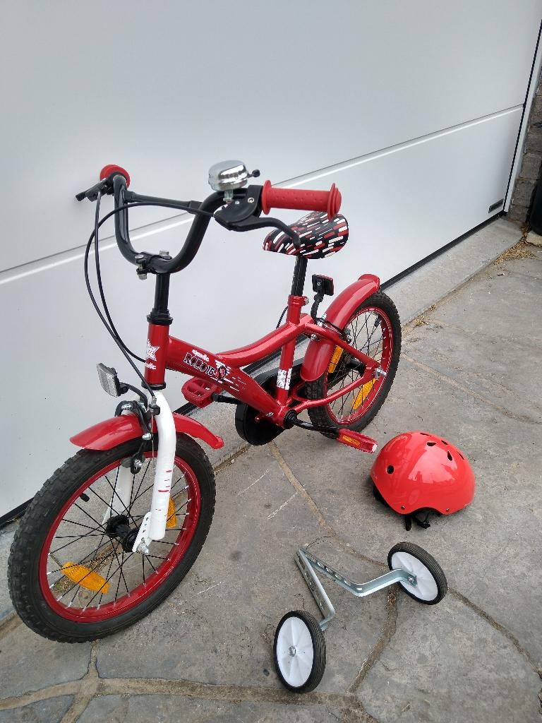 Voor kinderen van ongeveer 4 tot 7 jaar. Zeer weinig gebruikt, in perfecte staat, robuust en volledig uitgerust, 2 remmen, kettingbeschermer, bel enz... Met 2 kleine stabilisatiewielen die eenvoudig tZo goed als nieuw Ophalen