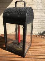 Stallantaarn; zwart geschilderd hout en glas. Bovenkant cilindervormig plaatijzer en gaten in ajour. H = 42 cm