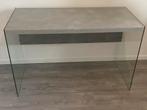 Modern minimalistisch bureau van tomasucci. 120X56x75cm betonlook bureaublad met glaspanelen als poten. Door de glaspanelen geeft