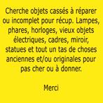 Cherche objets cassés à réparer ou incomplet pour récup. Lampes, phares, horloges, vieux objets électriques, cadres, miroir, statu